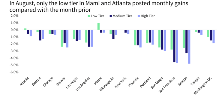 The month-over-month comparison of appreciation by price tier and location also reveals relative changes in demand across the country. From July to August, the pricier Western metros — particularly San Francisco; Seattle; San Diego; Los Angeles; Portland, Oregon and Denver — showed declines in monthly gains across price tiers. In fact, August was the third month of monthly declines in a number of metros. Again, August has historically seen an increase in monthly home price gains compared with July. Only the low tier in Miami posted a 1% monthly gain in August.