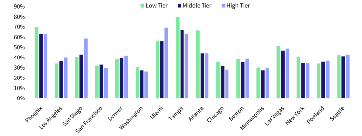Lastly, while home prices have cumulatively increased by about 41% since the beginning of the COVID-19 pandemic in March 2020, there are markets with significantly higher increases in some price tiers. Overall, Tampa saw the largest gain in the low tier, up by 80%, followed by a 70% increase in Phoenix. Miami and Tampa also led the 20 cities in the high tier, both with over 60% cumulative gains (Figure 6).