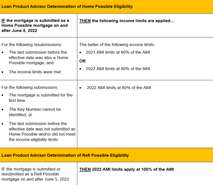 - If the mortgaged premises is located in a county where the AMI has increased and you submitted the loan before June 5, Loan Product Advisor will apply the higher 2022 AMI in determining possible income eligibility for Home Possible or Refi Possible mortgages.