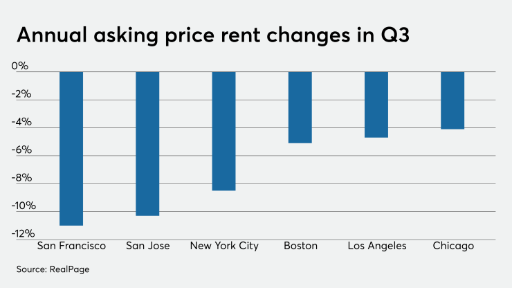 For San Francisco, the flight has been just as apparent. Effective asking rents in San Francisco dropped 11% in the third quarter, according to RealPage data, while its occupied apartment count declined by 3,637 in that period.