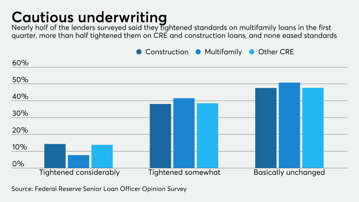 Additionally, for loans secured by multifamily properties, 49.2% of banks reported either significantly or somewhat tightening standards, while 50.8% said their standards had stayed the same.