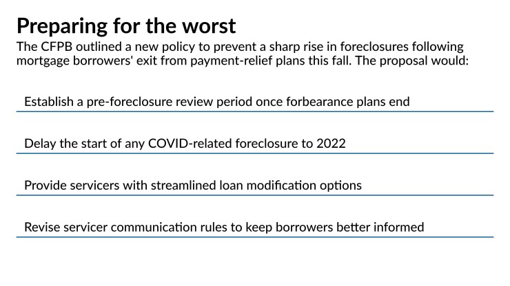 At the end of a forbearance period, the proposal requires servicers to inform borrowers if they can extend their forbearance plan again and to detail to them their loss mitigation options. If finalized, those provisions would be in effect until Aug. 31, 2022.