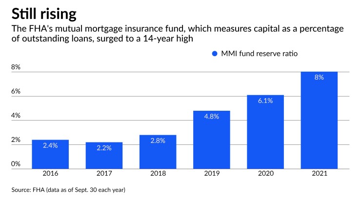 But despite a 14-year high of 8.03% for the capital ratio of the agency's mutual mortgage insurance fund — stoked by the recovery of the reverse mortgage program — the FHA did not signal immediate plans in its annual actuarial report to cut insurance premiums. The FHA is taking a "cautionary approach" to pricing in light of delinquencies and uncertainty about loans in forbearance, officials said.