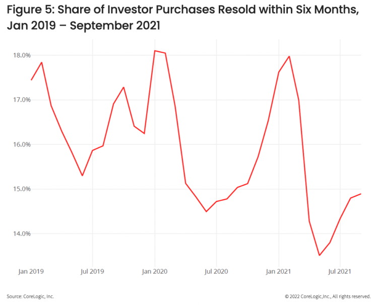 Most investors are buying to rent out the homes rather than to flip them. Figure 5 shows the share of homes purchased by investors that were resold within six months through September 2021. The graph shows that only 14.9% of homes purchased by investors in September had been resold by April, a 0.1% decline from September 2020 and a 2% decline from September 2019. Of course, flippers generally resell homes to owner-occupied buyers in the summer so this rate will likely increase over the next few months. However, there is little reason to believe sales figures will rise above historical norms.